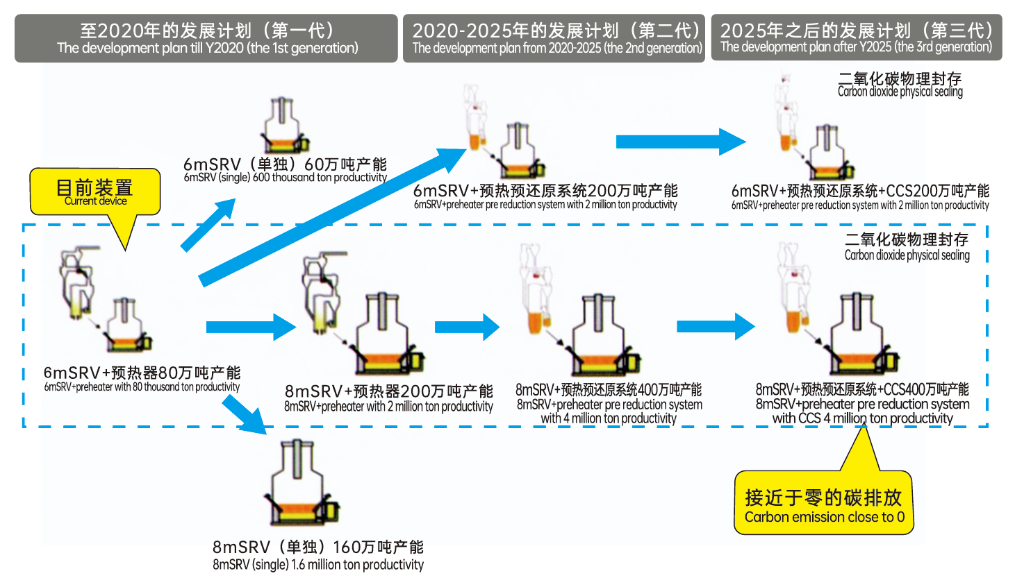 The future plan is to build a Hlsmelt smelting reduction system with a diameter of 8 meters and an annual output of 2-4 million tons of high-quality pig iron products. By redesigning and selecting some equipment without changing the process flow, the system's production capacity can be significantly increased.
