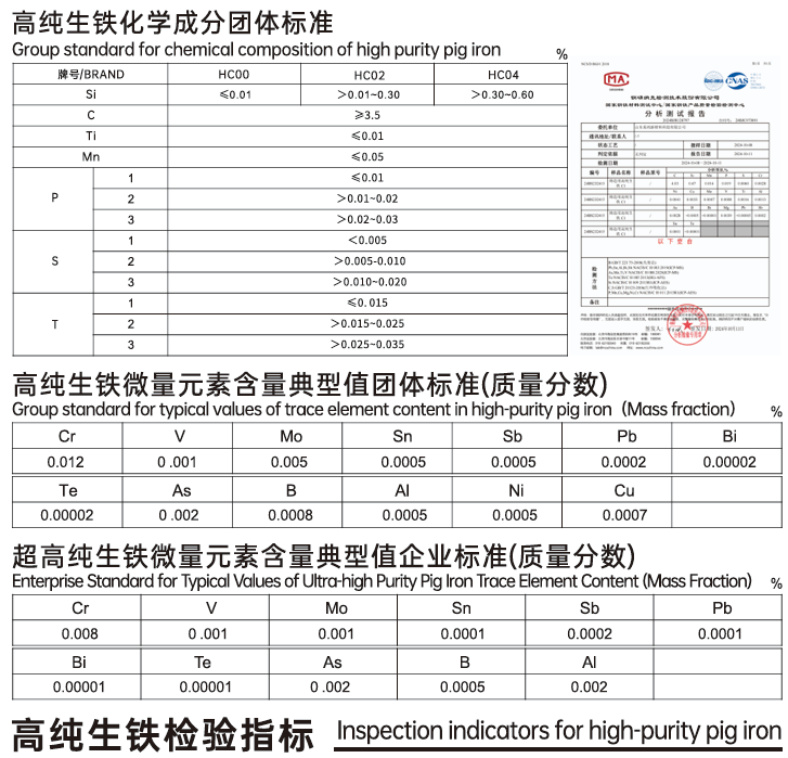 The main products include cast high-purity pig iron and high-quality high-purity special pig iron. The five harmful elements in the products are extremely low, mainly used in high-speed rail, nuclear power, wind electric forging, aerospace, various low-temperature impact resistant castings and ductile iron parts, which can greatly improve the compressive strength, tensile strength, elongation and low impact resistance of castings and forgings.